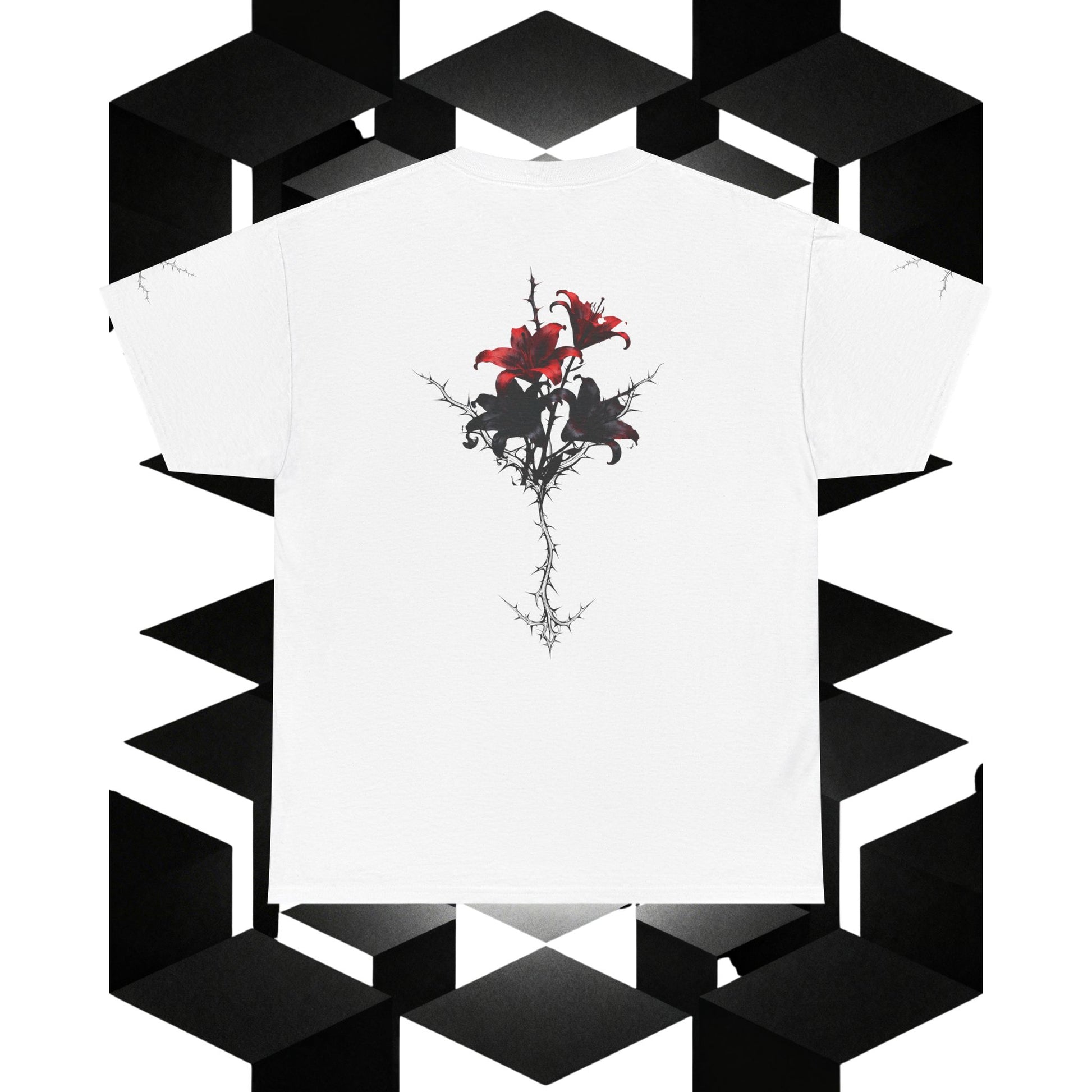 A Premium clean, soft cotton tee that quietly carries a dark botanical statement. The front keeps things minimal with a tiny, distressed motif at the chest. Turn around and a thorned stem unfurls into a cluster of painterly lilies—deep reds bleeding into charcoal grays—so the shirt reads like wearable micro-poetry. The cut is relaxed and breathable, letting the artwork sit naturally on the body. Wear it to underscore a mood, anchor a layered outfit, or carry a subtle, expressive touch to city nights, gallery visits, or low-key meetups.