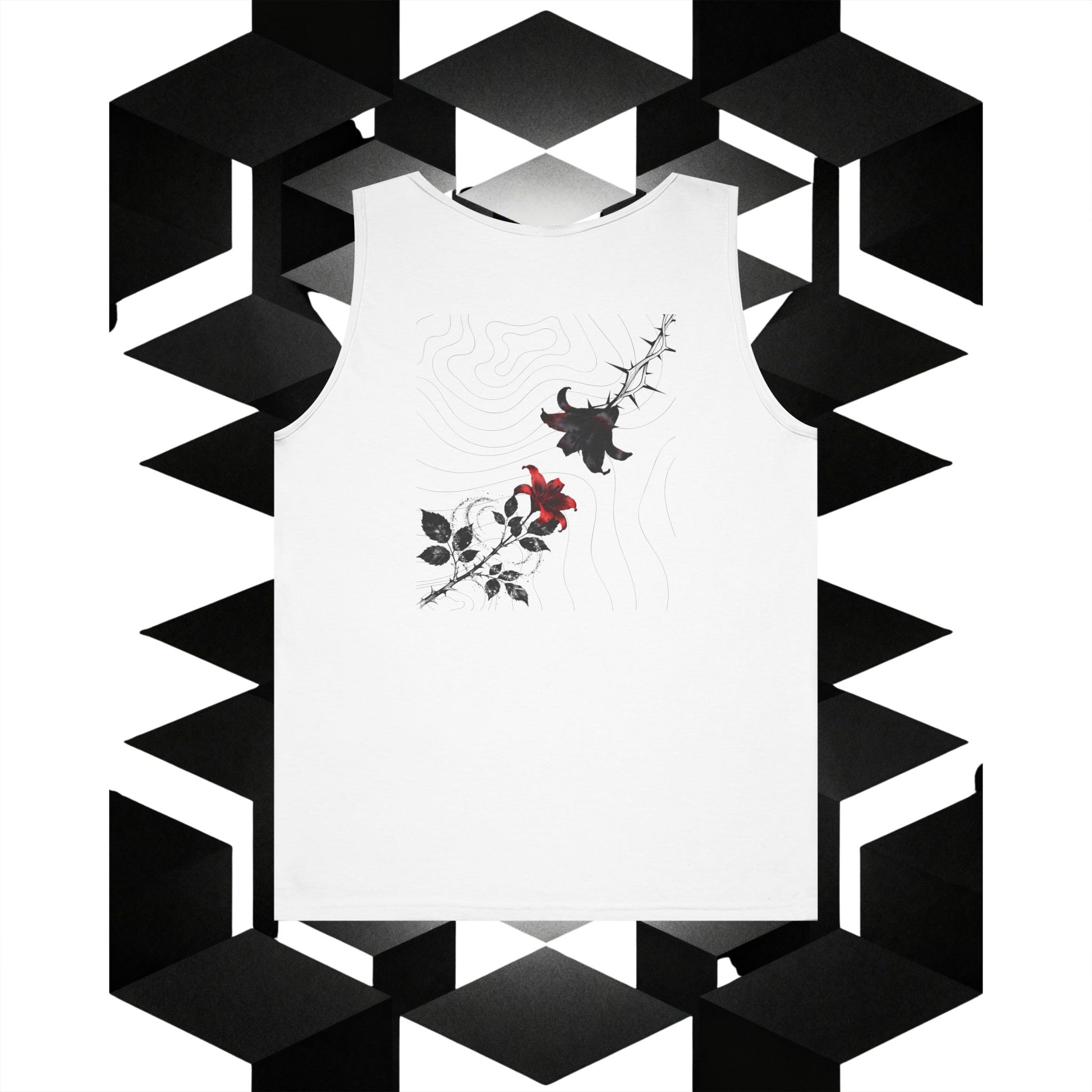 A Premium, lightweight, classic-fit tank that blends minimalist street style with a subtle gothic-floral edge. The soft white fabric carries two restrained printed treatments — a small, distressed band-style wordmark across the chest and a delicate vertical spray of black-and-red flowers down the front — for a look that feels both modern and slightly moody. Wear it layered under an open flannel or alone on warm evenings; the clean silhouette keeps the focus on the art while the medium-weight cotton holds shape and moves with you. This tank reads like quiet confidence: not flashy, but unmistakably expressive.