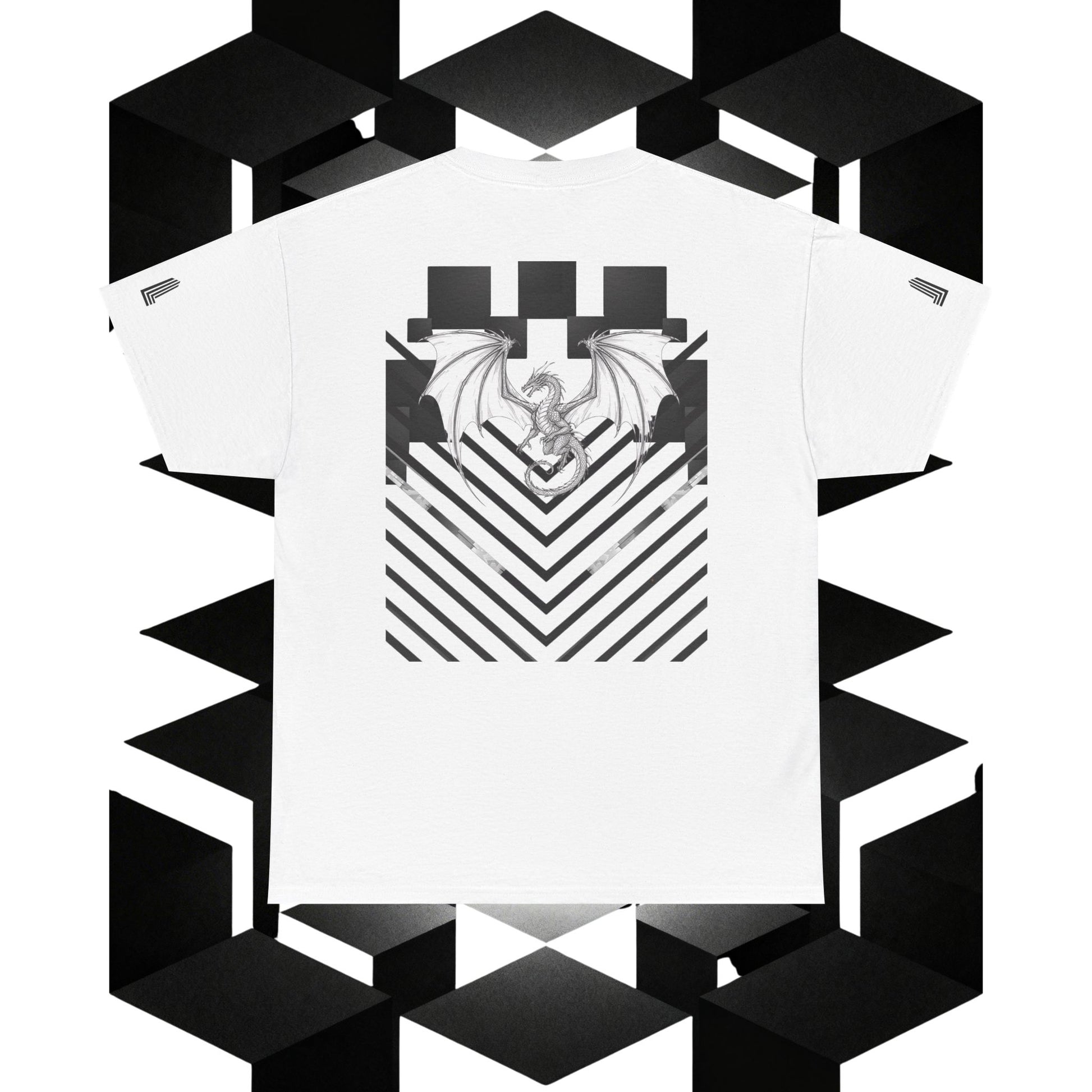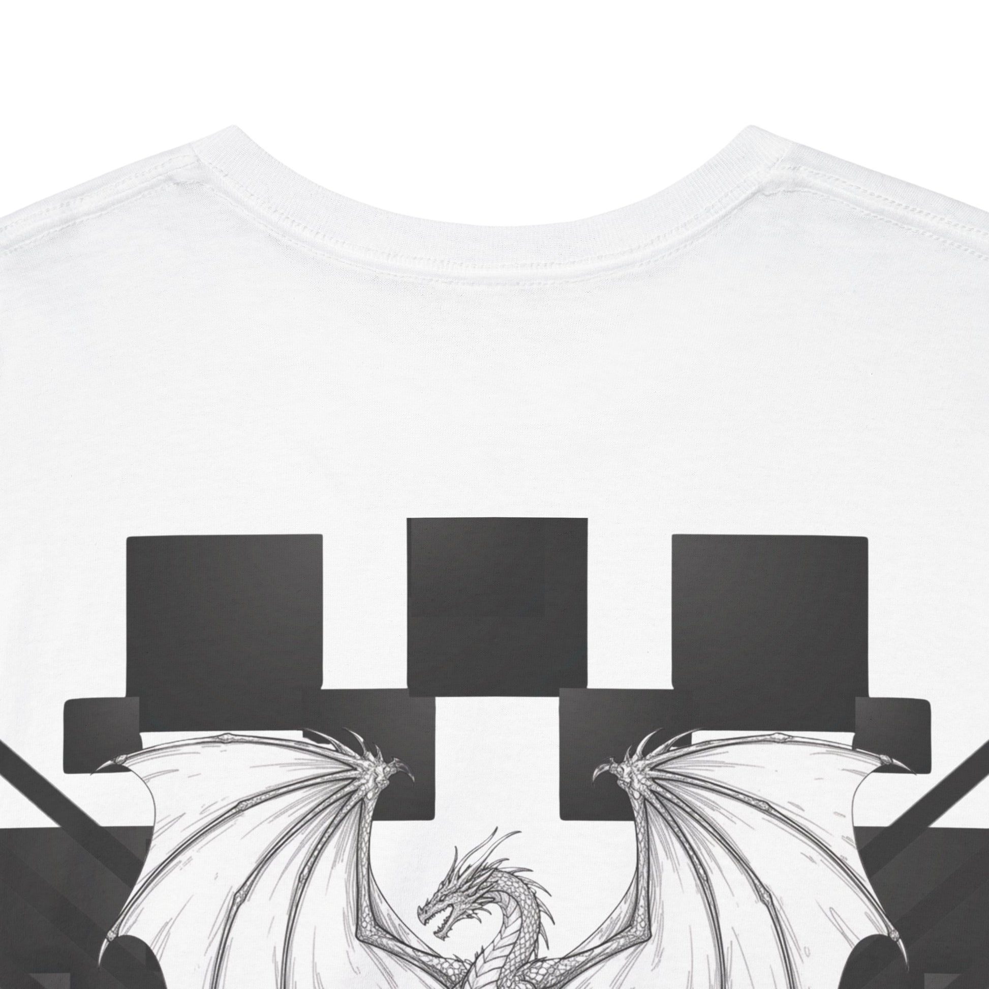A clean, sculpted staple with a darkly poetic edge. This premium cotton tee lays flat and solid—soft where it touches skin, structured where shape matters—so the subtle chest script and bold back artwork read like quiet statements. The front carries a refined, serif logo that feels like a line of whispered intent. On the back, an angular geometric field frames a heraldic dragon, mixing medieval mood with modern graphic rhythm. Wear it when you want an undercurrent of story: walking city streets at dusk, swapping records with friends, or layering under a jacket for shows and late-night hangs. It settles into everyday life while hinting at mystery — an easy canvas for someone who appreciates deliberate, slightly dark design.