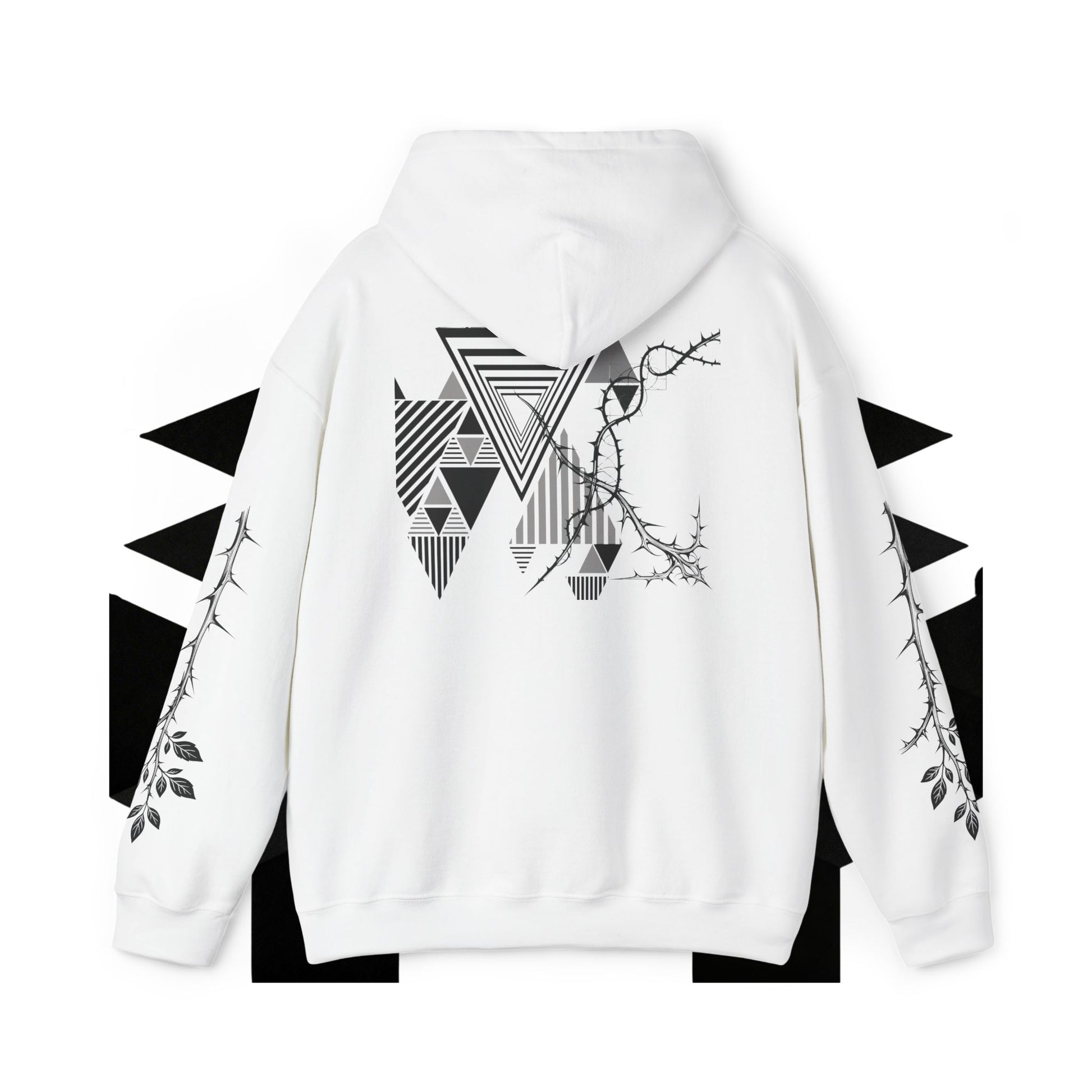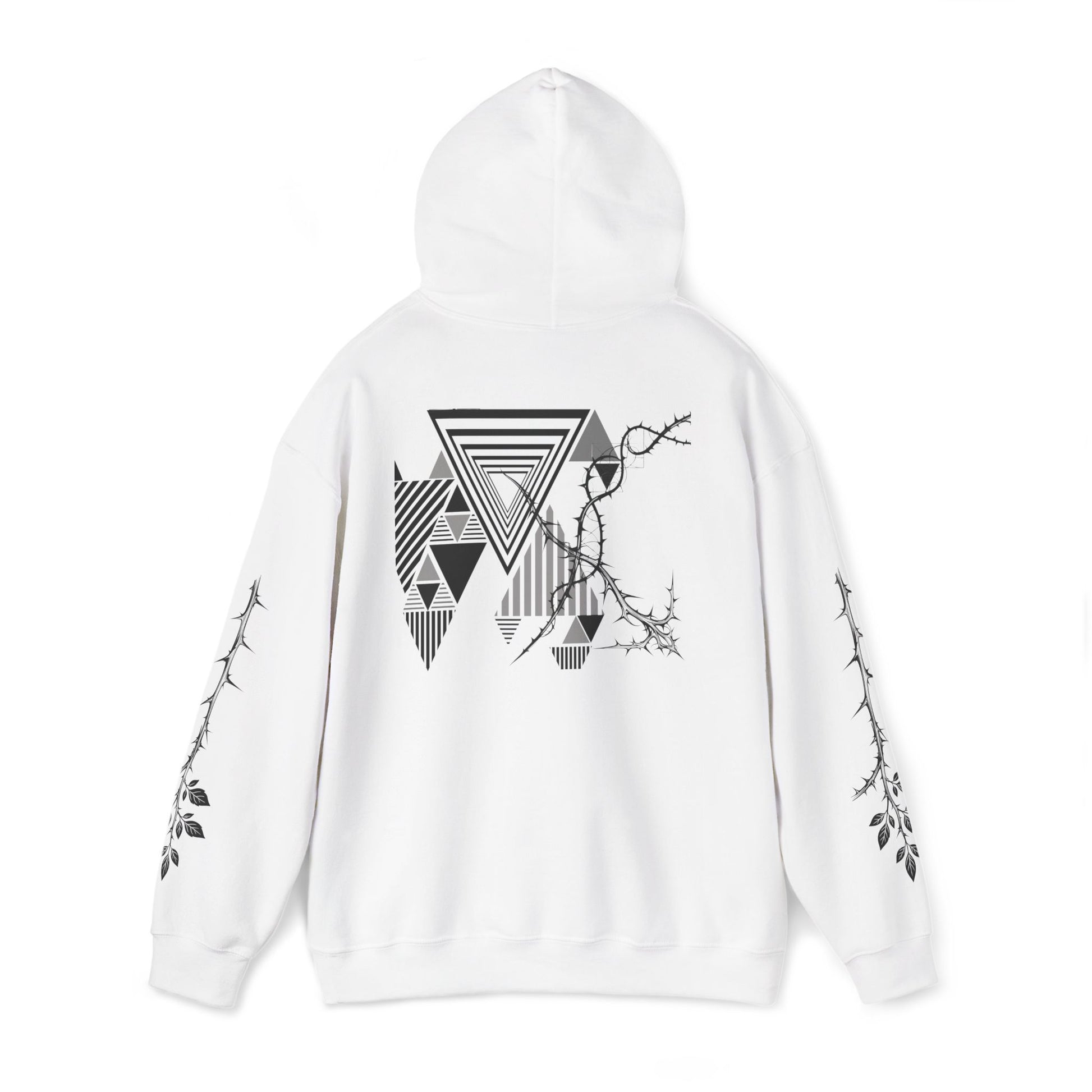 A Premium Soft, structured warmth with a quiet, graphic edge. This medium-weight hooded sweatshirt blends the cozy feel of a classic pouch hoodie with minimalist, nature-meets-geometry artwork. Subtle thorn-and-leaf motifs crawl along the sleeves while a layered triangle composition sits across the upper back — all in muted grayscale for an underplayed, modern look. Wear it on slow mornings, late-night walks, or layered under a jacket when the air turns sharp. It settles into your rotation easily: comfortable, slightly edgy, and sincere in its mood.