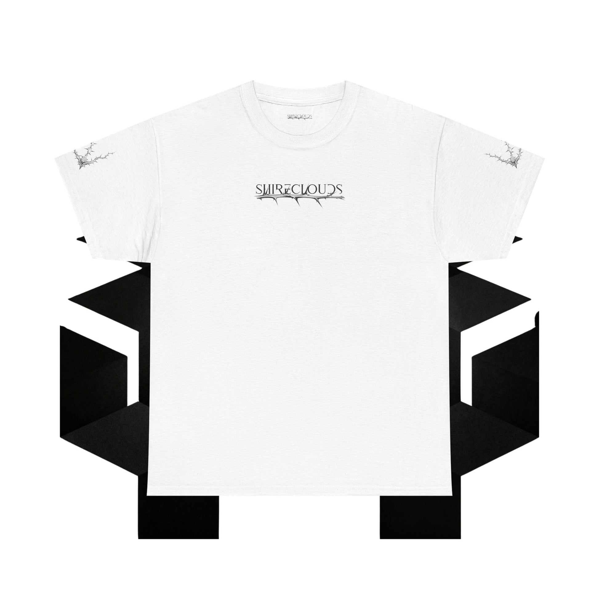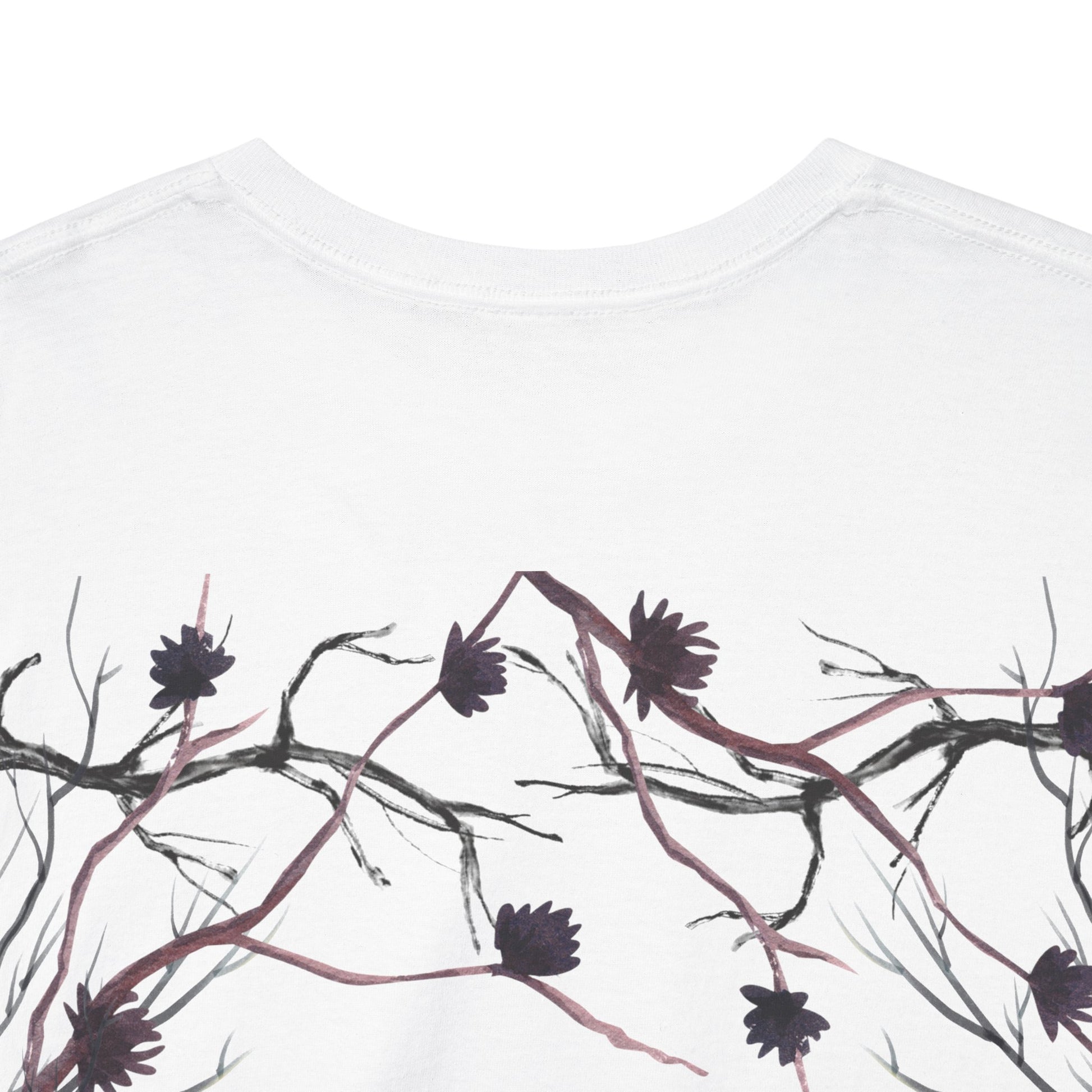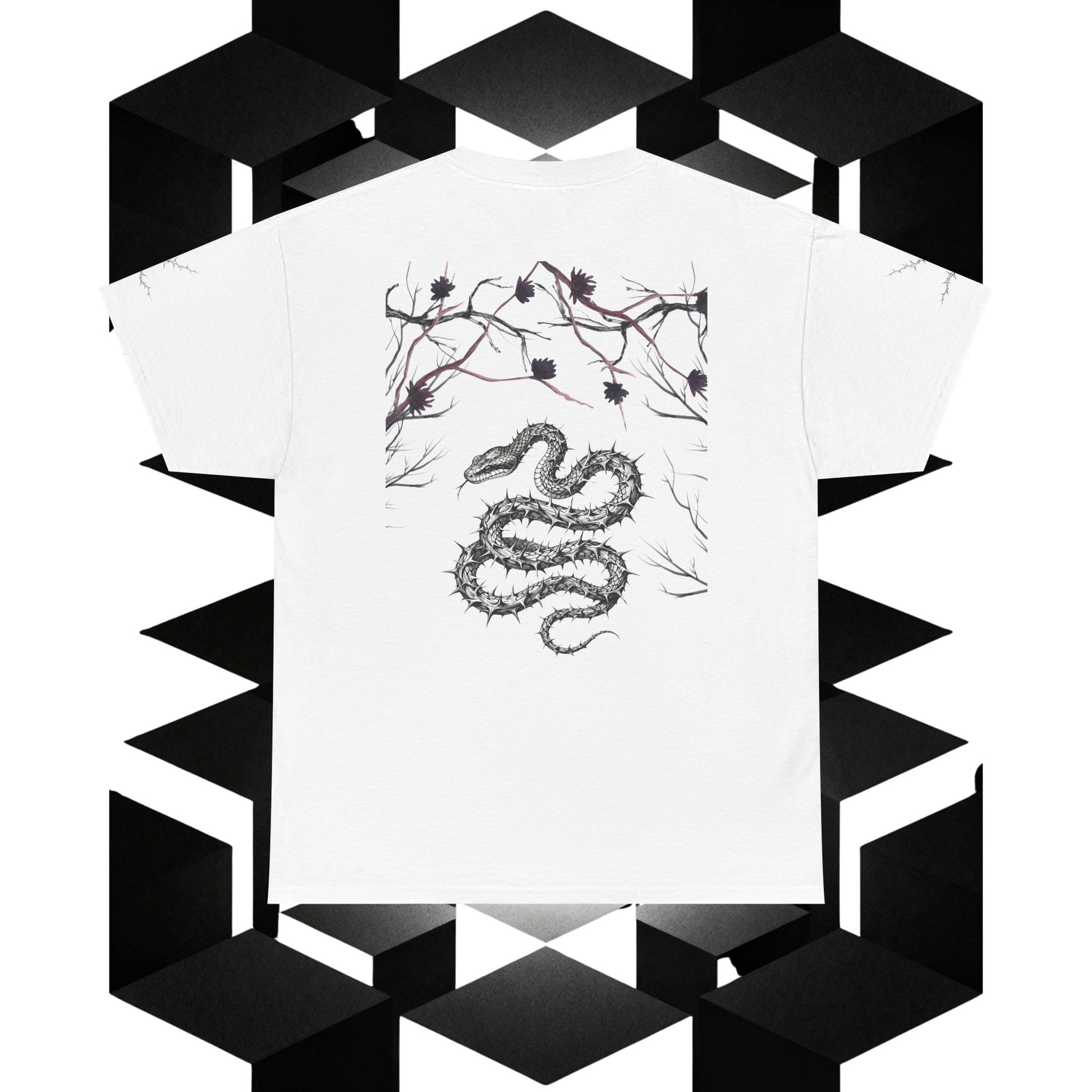 A timeless white premium cotton tee with a dark, artful edge — a soft, breathable classic that wears like a favorite. The front carries a small, subtly distressed typographic mark across the chest, while the back unfolds into a monochrome illustration: a sinuous serpent woven among thorned vines and drifting leaves. The imagery feels quiet and slightly uncanny, made for someone who prefers understated statements over loud logos. Lightweight yet sturdy, the shirt holds prints with fine detail and a matte finish, so the design reads clearly without glare. Wear it layered under a jacket on crisp evenings, or alone when you want the artwork to speak for itself.