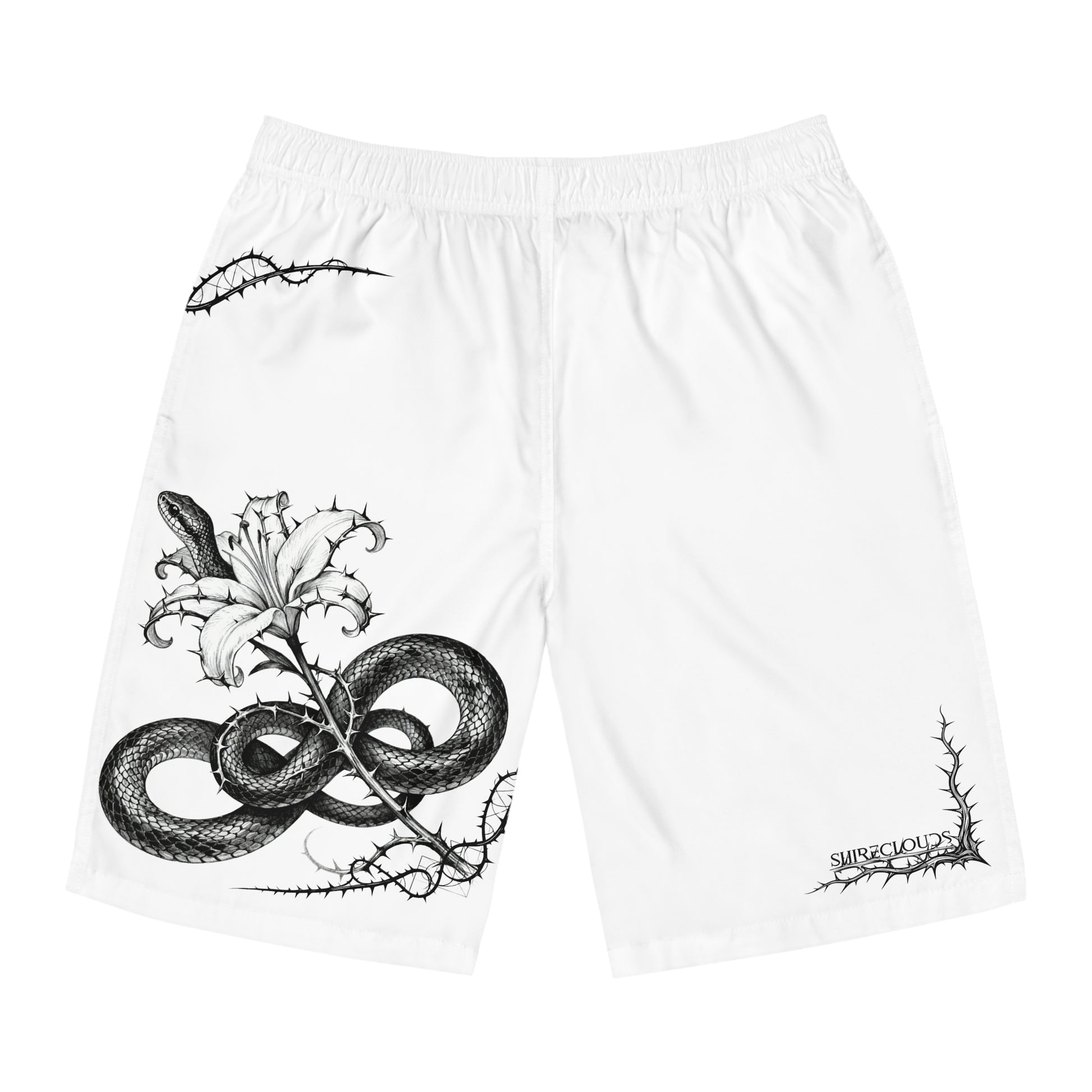 These Premium board shorts bring a quiet, edgy energy to long days by the water. Lightweight and fast-drying, they move with you whether you’re chasing a wave or lounging on sun-warmed rocks. The monochrome artwork — a coiled serpent threaded through a blooming lily and framed by thorny accents — feels like a secret sketch found in a traveler's journal: part coastal grit, part botanical stillness. The elastic waistband and drawstring sit comfortably at the hips while side pockets hold small essentials. Wear them to surf, paddle, or wander boardwalks when you want gear that’s low-profile but unmistakably individual.