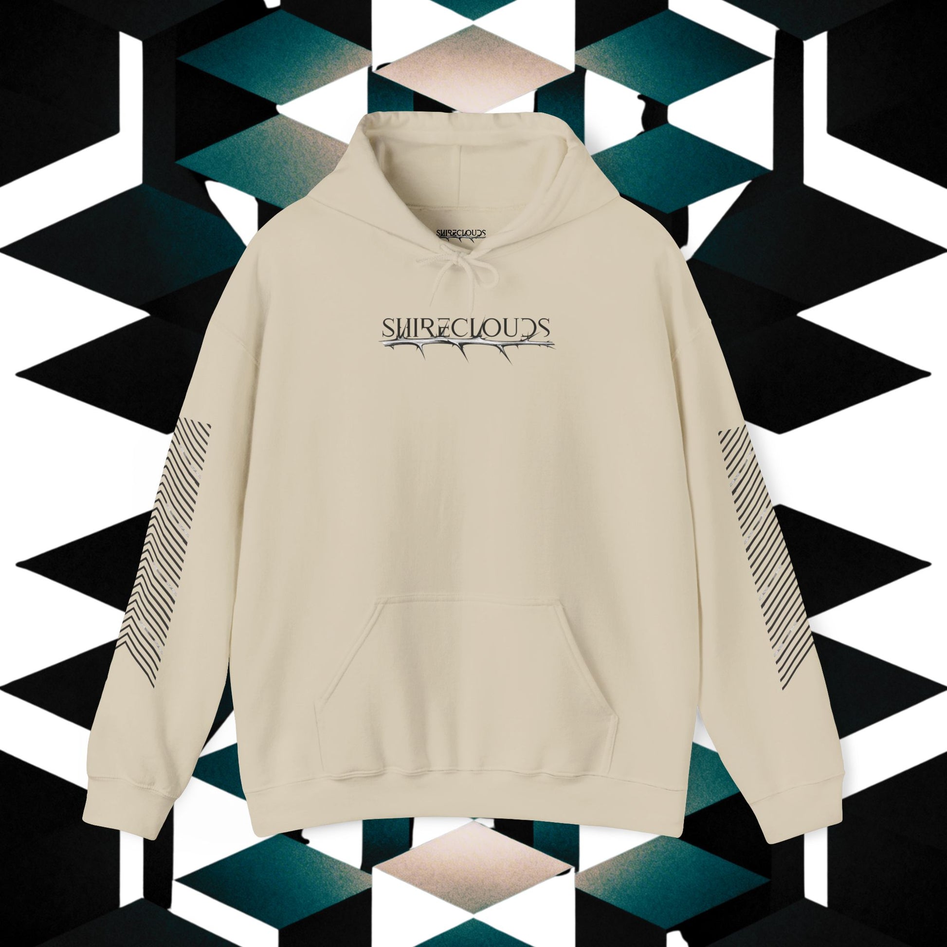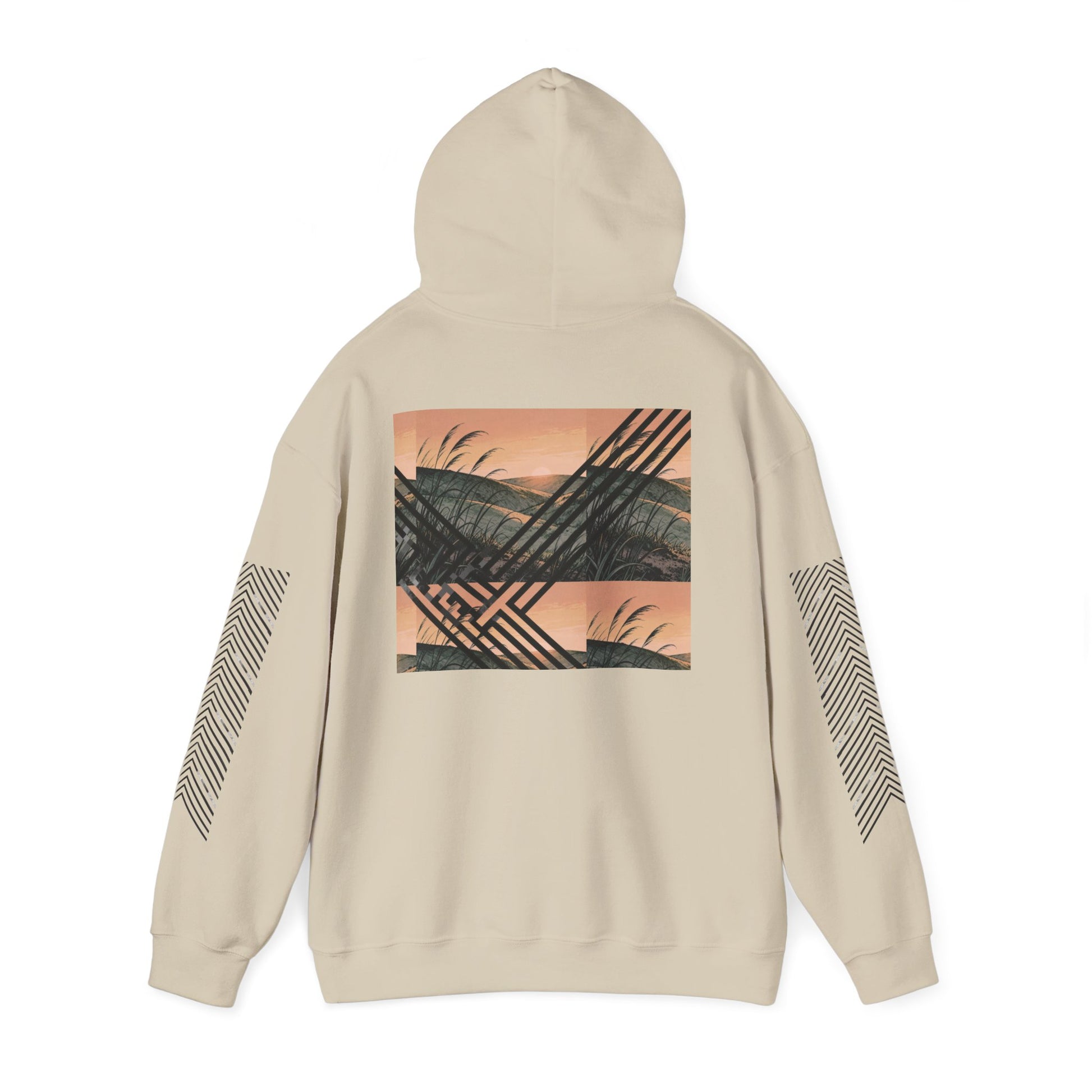 A soft, mid-weight premium hoodie that blends subtle streetwear with quiet landscapes. The front features a restrained, stylized wordmark while the back showcases a layered sunset-and-grass artwork in muted, earthy tones. Angular sleeve stripes add a modern, graphic edge that reads well over a neutral palette. Wear it when you want to slow down but still look intentional — a go-to layer for cool mornings, late-night walks, and nights around a low fire.