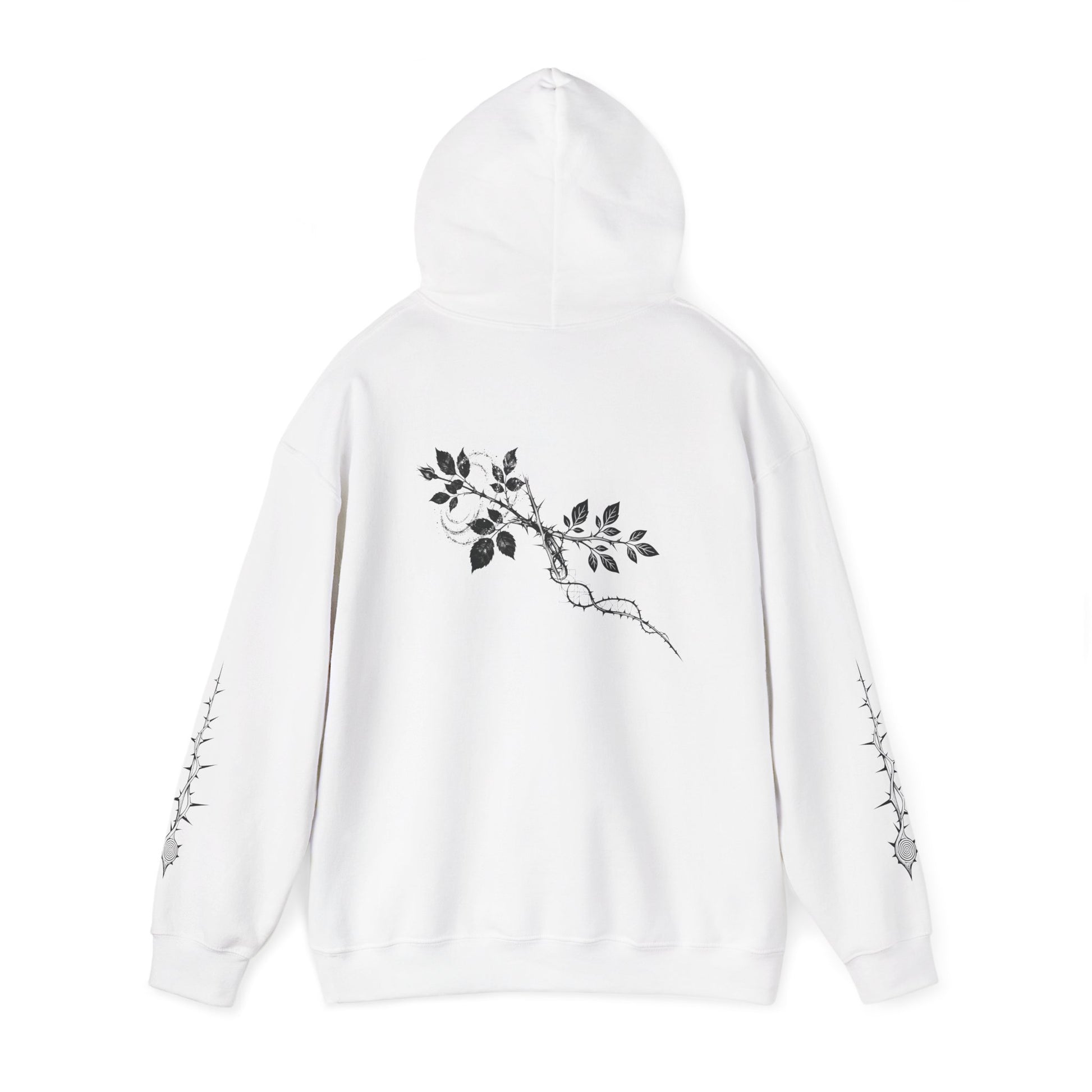Premium Soft, oversized hoodie with a moody, minimalist vibe. The front carries a subtle, gothic-style wordmark while the back shows a delicate monochrome vine that creeps across the shoulders. Slim thorn motifs run down both sleeves, adding edge without shouting. Lightweight but warm, the hood and pouch pocket make it a go-to layer for late-night walks, coffee runs, or hanging out with friends. It feels personal — like something you’d reach for when you want to look composed but a little mysterious.